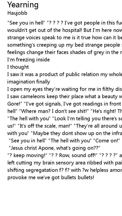"See you in hell" "? ? ? ? I've got people in this fucking platoon so sick they wouldn't get out of the hospital! But I'm here now ? ? ? ?. Come on. Fuck!" strange voices speak to me is it true how can it be hidden under my bed something's creeping up my bed strange people strange places change their feelings change their faces shades of grey in the night you know