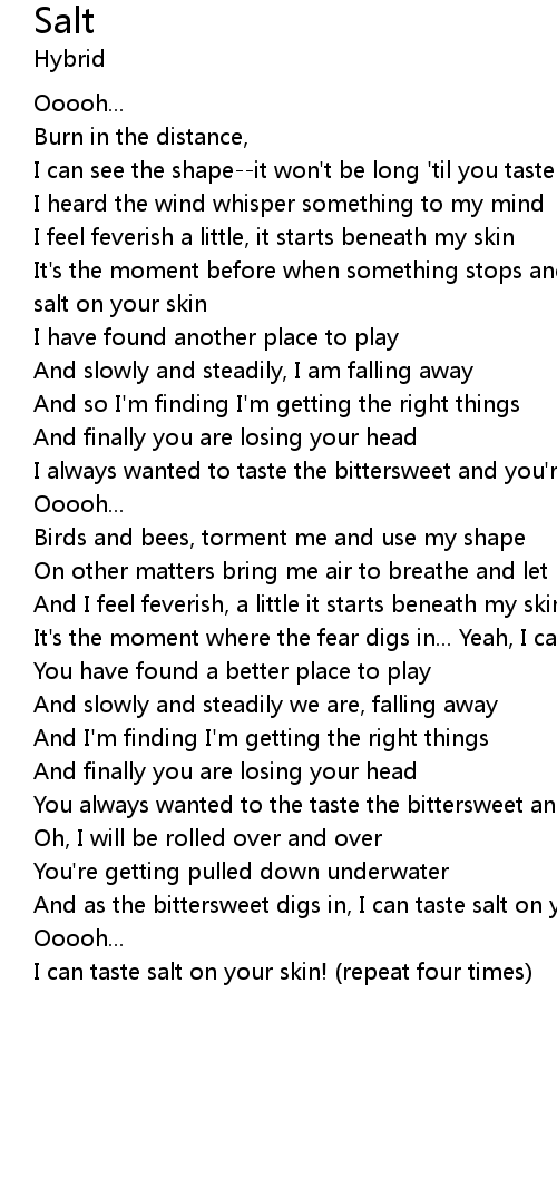 And as the bittersweet digs in, I can taste salt on your skin. |