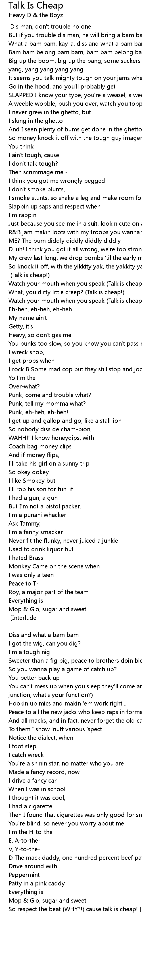 So knock it off, with the yikkity yak, the yakkity yak and jump off the dilzznick [Chorus: repeat 2X] (Talk is cheap!)