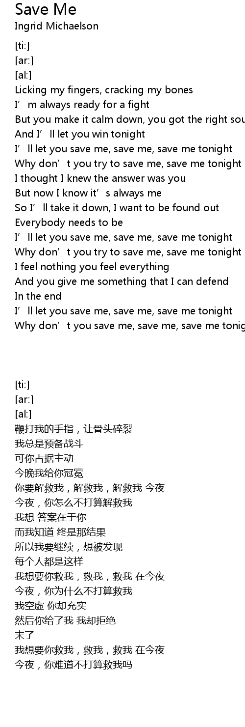 | [00:36.72] | Why don’t you try to save me, save me tonight |