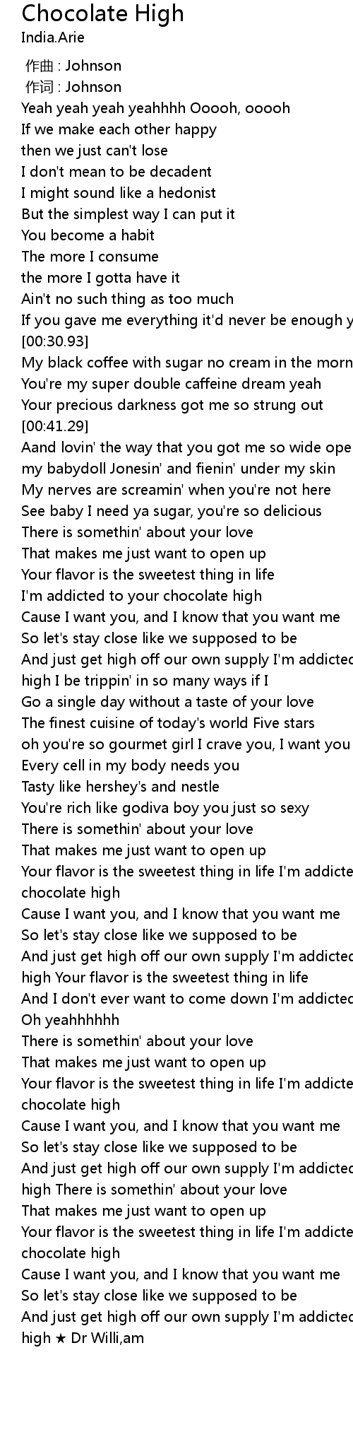 | [02:20.72] | And I don' t ever want to come down I' m addicted to your chocolate high Oh yeahhhhhh |