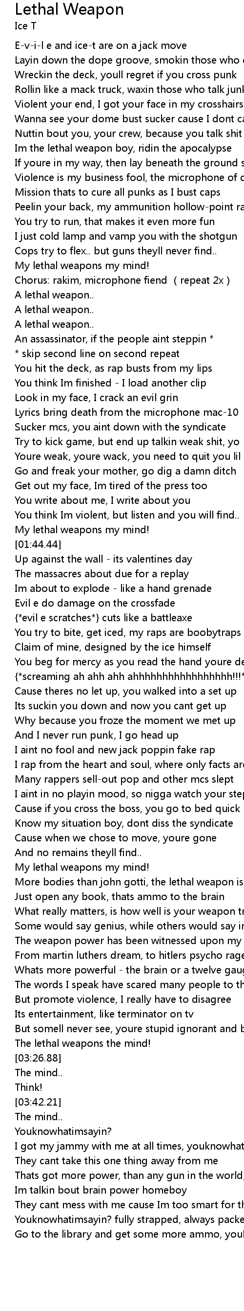 | [03:00.30] | More bodies than john gotti, the lethal weapon is slaying |