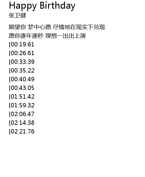 | [02:51.88][02:06.47][01:04.90] | HAPPY BIRTHDAY TO YOU HAPPY BIRTHDAY TO YOU |