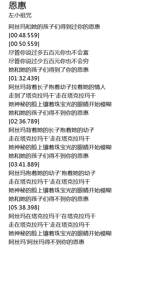 | [05:47.288] | 阿丝玛在塔克拉玛干'在塔克拉玛干 |