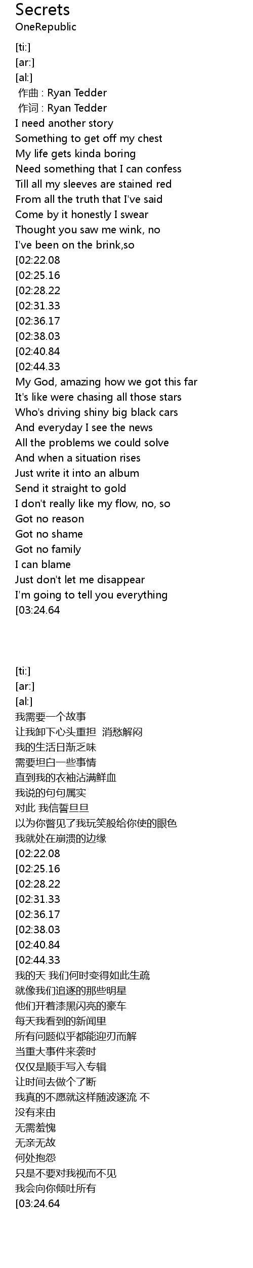 | [02:57.25][02:31.33][01:39.41][00:47.41] | So I'm going to give all my secrets away |