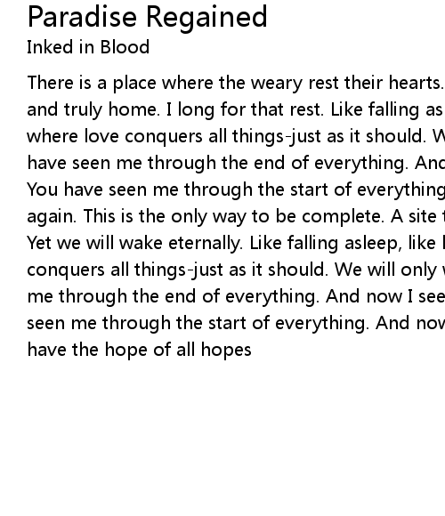 There is a place where the weary rest their hearts. Where we are truly in love, and truly home. I long for that rest. Like falling asleep, like being at peace, where love conquers all things-just as it should. We will only weep for joy. You have seen me through the end of everything. And now I see we're beginning again. You have seen me through the start of everything. And now I see we're beginning again. This is the only way to be complete. A site to dream of-and not to tell. Yet we will wake eternally. Like falling asleep, like being at peace, where love conquers all things-just as it should. We will only weep for joy. You have seen me through the end of everything. And now I see we're beginning again. You have seen me through the start of everything. And now I see we're beginning again. We have the hope of all hopes |