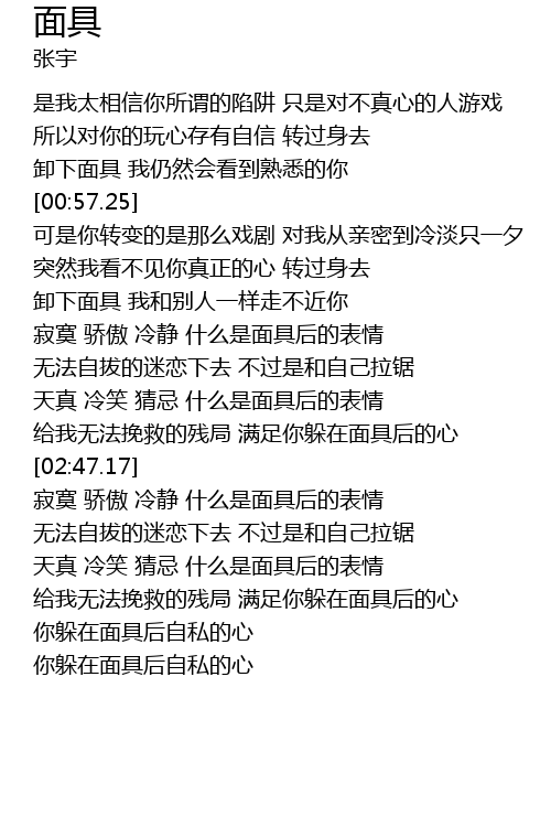 | [01:55.70] | 寂寞 骄傲 冷静 什么是面具后的表情 |