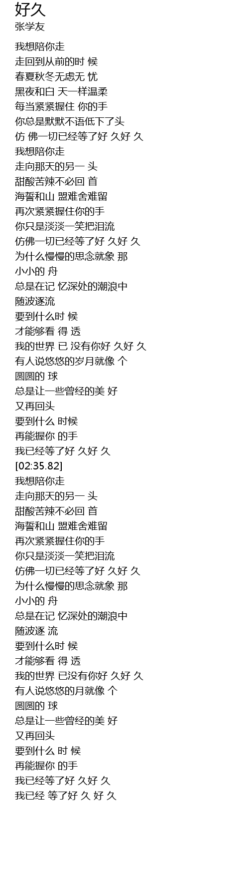 | [02:25.62] | wǒ yǐ jīng děng le hǎo jiǔ hǎo jiǔ |
