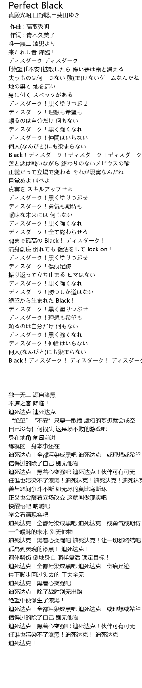 | [03:32.77] | 何人(なんびと)にも染まらない Black!ディスダーク! ディスダーク! ディスダーク! |