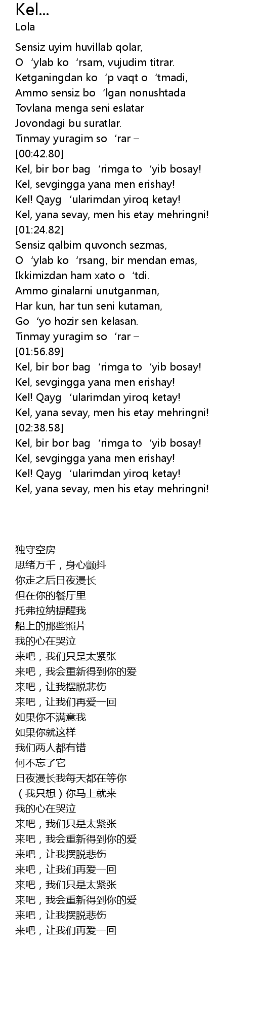 | [00:54.50] | Kel, sevgingga yana men erishay! |