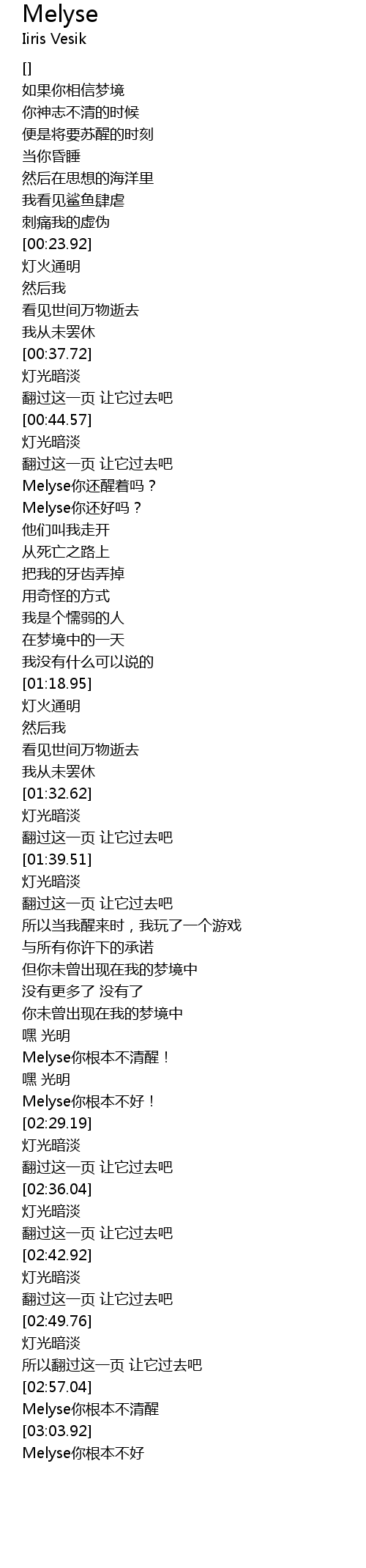 | [01:00.89] | Melyse nǐ hái hǎo ma? |
