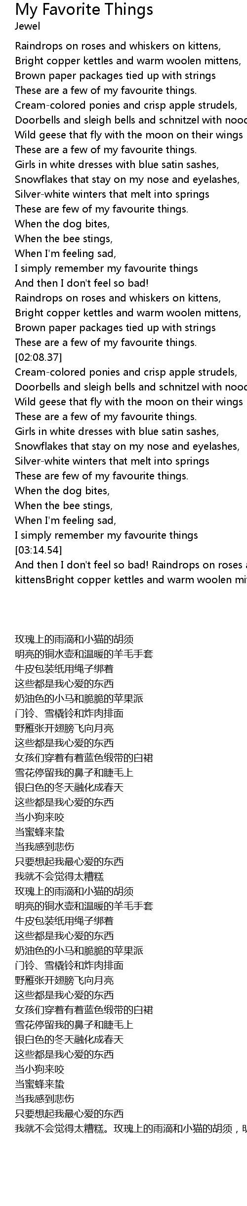 And then I don't feel so bad! Raindrops on roses and whiskers on kittensBright copper kettles and warm woolen mittens |