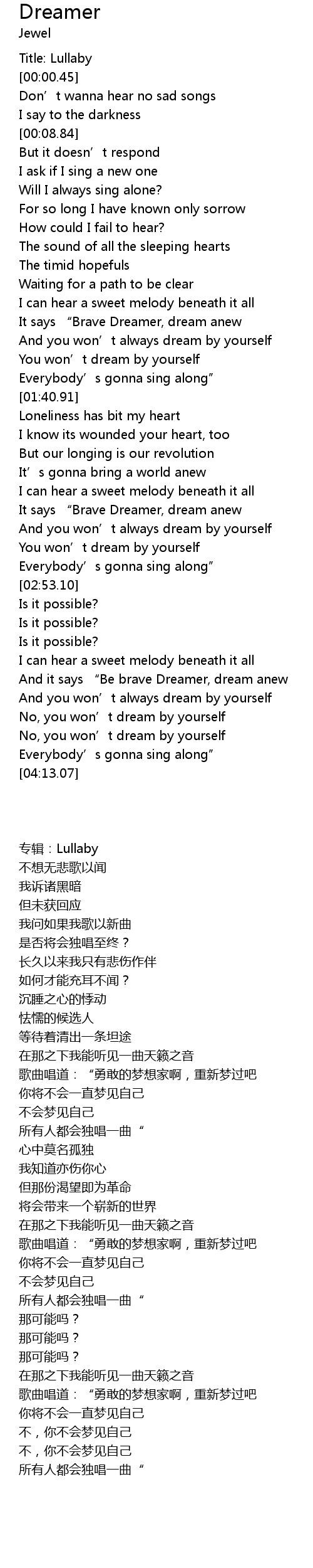 | [03:29.81] | And it says “Be brave Dreamer, dream anew |