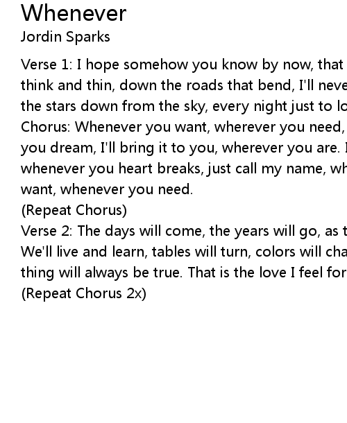 Chorus: Whenever you want, wherever you need, whatever you wish for, whatever you dream, I'll bring it to you, wherever you are. I won't be that far. Oh, whenever you heart breaks, just call my name, wherever you are, whatever you want, whenever you need. |