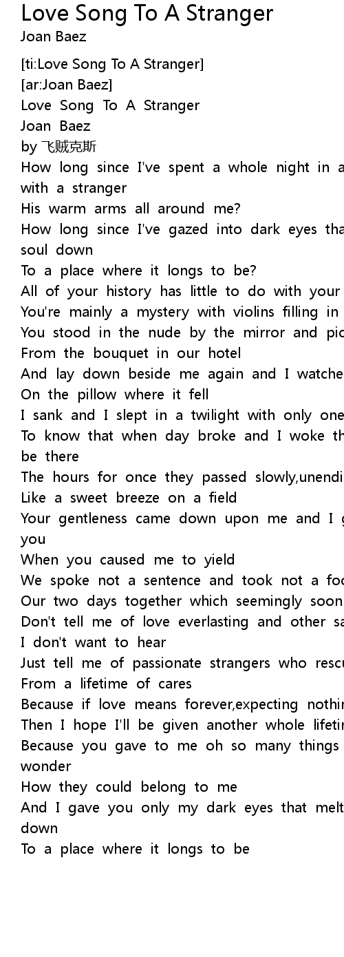 | [02:44.384] | Just tell me of passionate strangers who rescue each other |