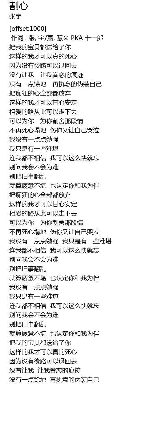 | [00:00.00] | 作词 : 張, 宇/蕭, 慧文 PKA 十一郎 |