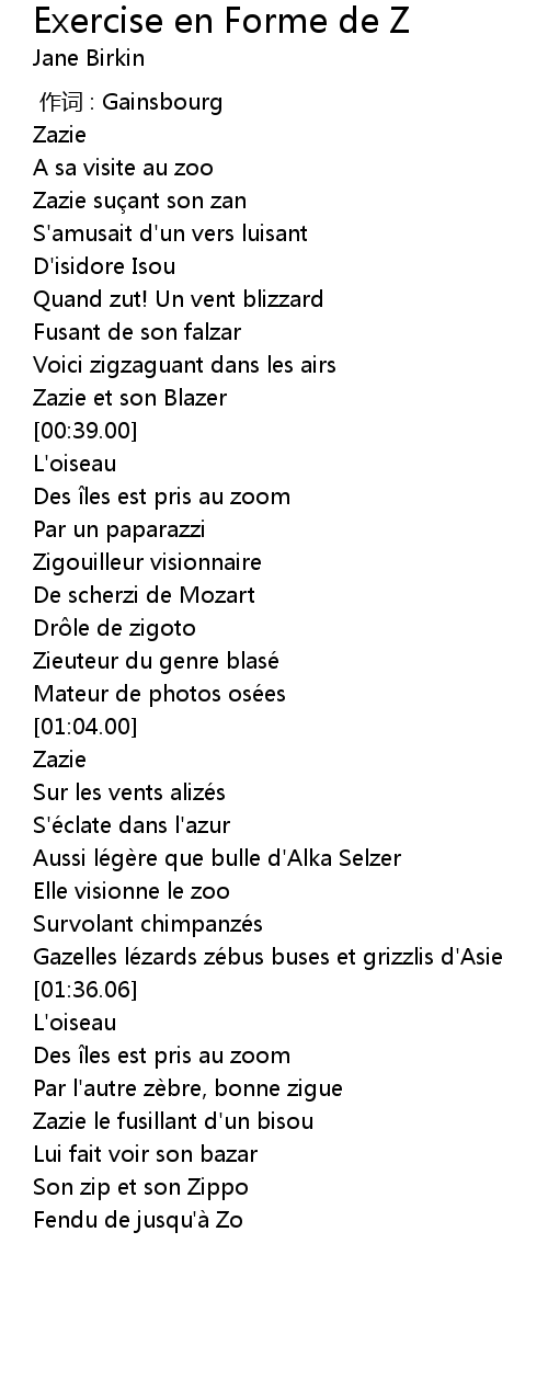 | [01:42.00] | Par l'autre zèbre, bonne zigue |