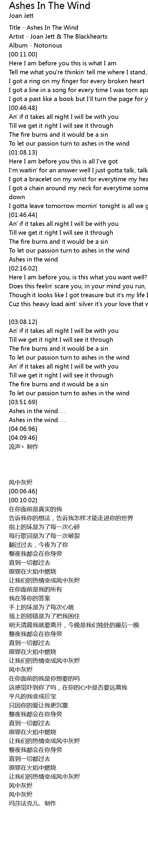 | [00:00.00] | Title - Ashes In The Wind |