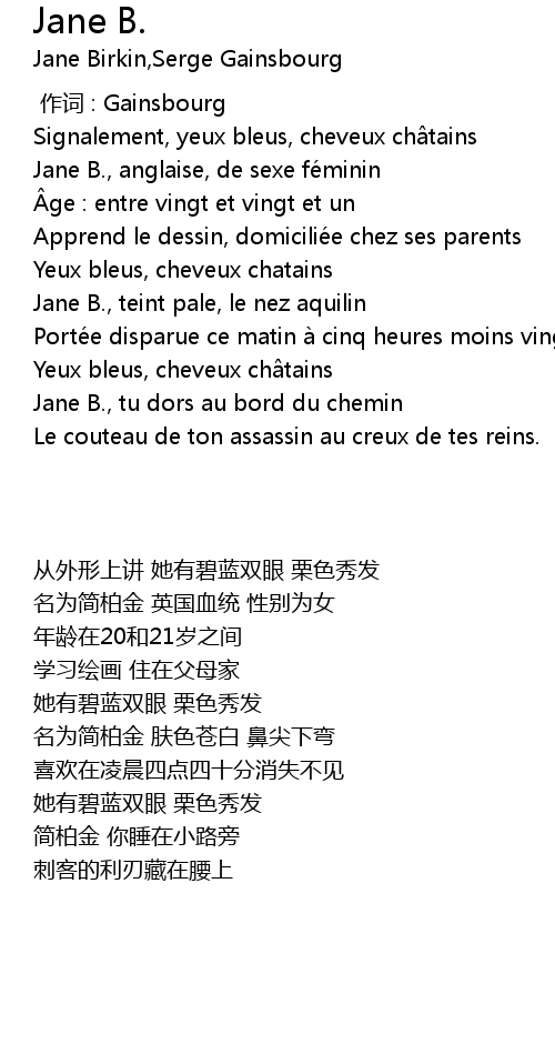 | [01:00.03] | Jane B., teint pale, le nez aquilin |