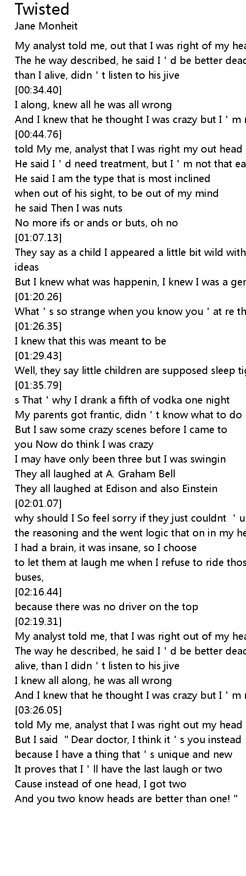 | [00:23.34] | My analyst told me, out that I was right of my head |