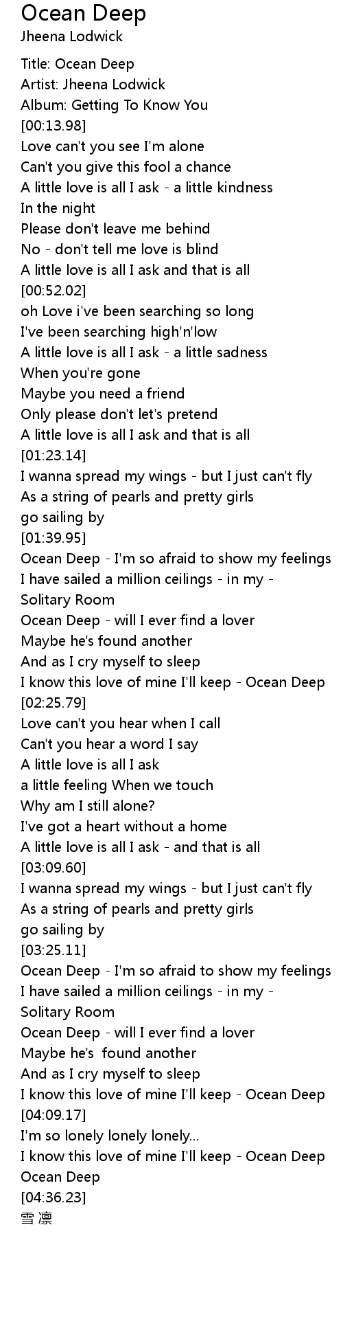 | [01:41.70] | Ocean Deep I' m so afraid to show my feelings |