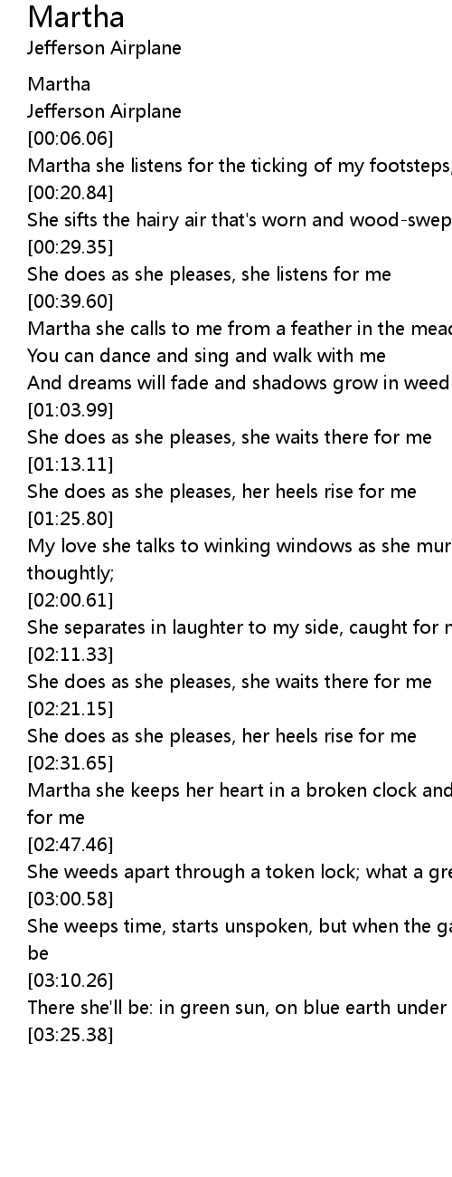 | [00:47.42] | Martha she calls to me from a feather in the meadow, "fly to me" |