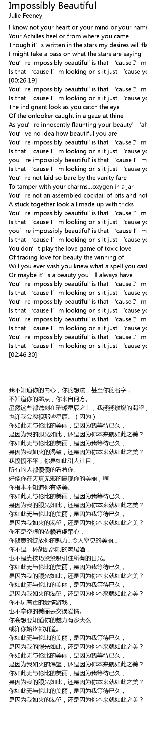 | [01:03.98] | you' re impossibly beautiful' is that ' cause I' m waiting |
