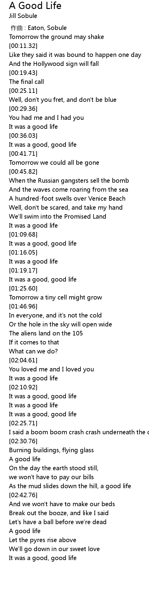 | [01:12.86] | It was a good, good life |