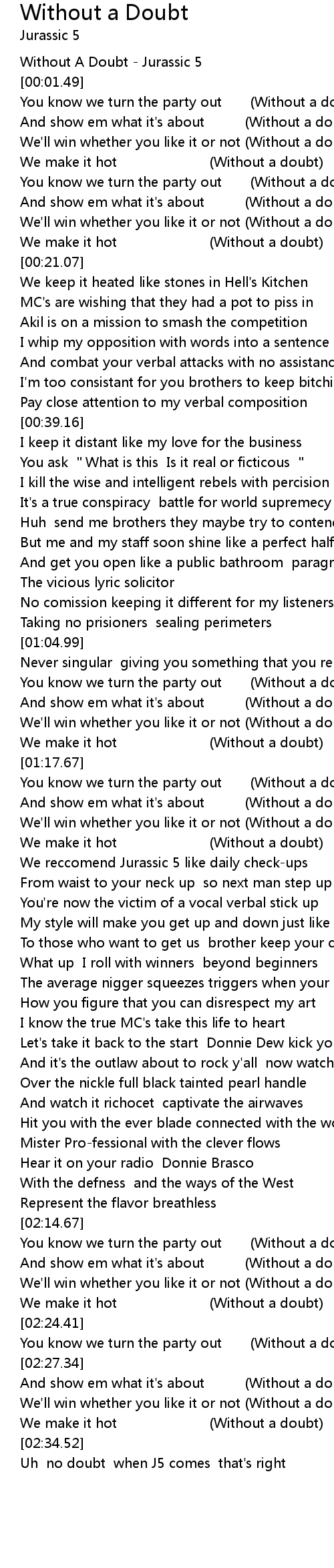 | [00:00.11] | Without A Doubt Jurassic 5 |