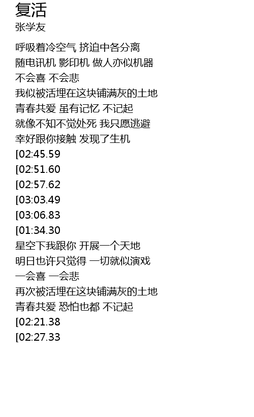 | [03:35.71][01:34.30] | 如复活 如复活 如复活 |