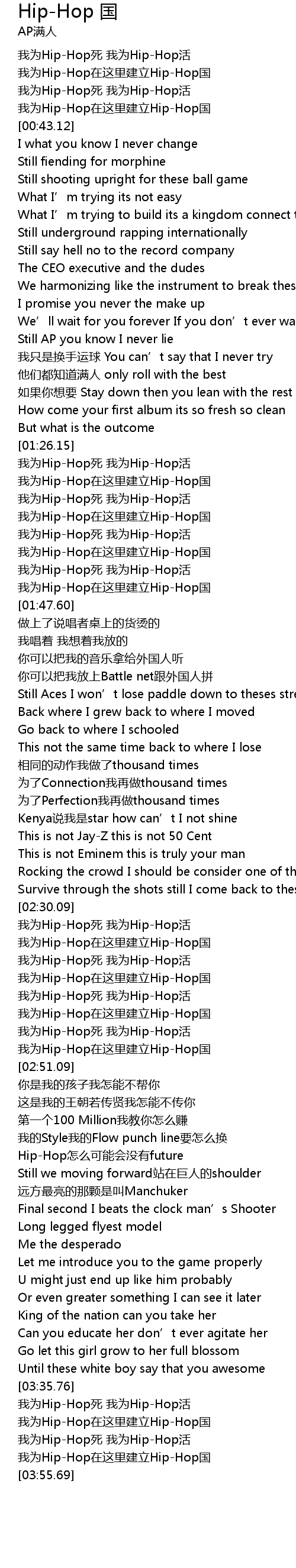 | [00:35.51] | wǒ wèi HipHop zài zhè lǐ jiàn lì HipHop guó |