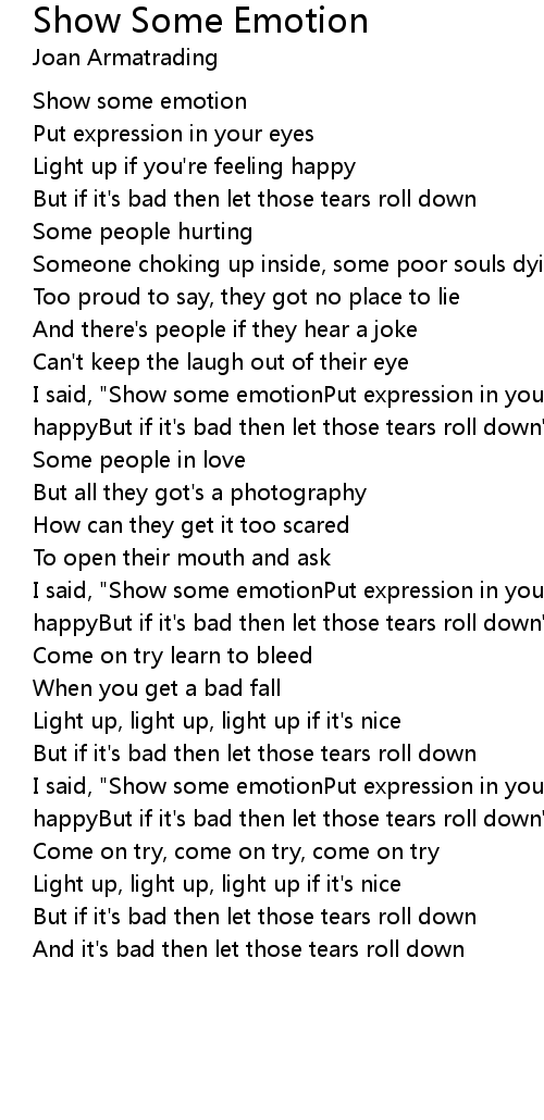 I said, "Show some emotionPut expression in your eyesLight up if you're feeling happyBut if it's bad then let those tears roll down"