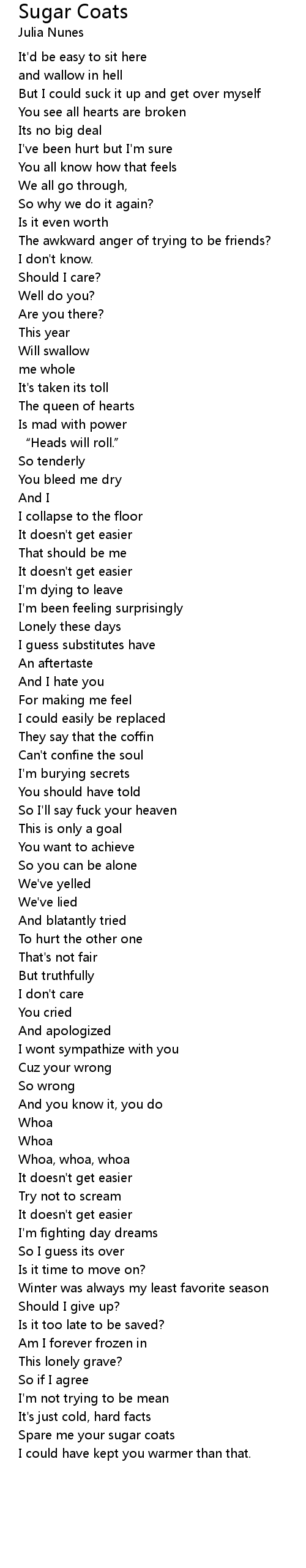 | Spare me your sugar coats | |