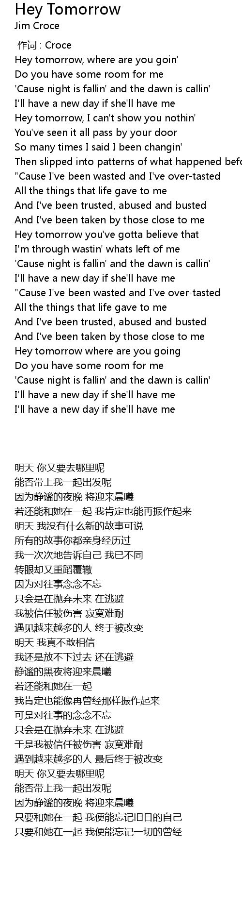 | [01:23.000] | Hey tomorrow you' ve gotta believe that |
