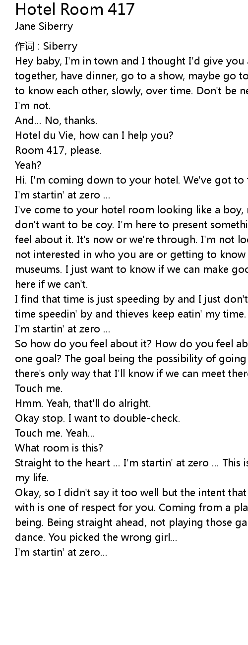 | I've come to your hotel room looking like a boy, no makeup, my hair's a mess, I don't want to be coy. I'm here to present something to you and to see how you feel about it. It's now or we're through. I'm not looking to make friends. I'm not interested in who you are or getting to know you, going to art galleries or museums. I just want to know if we can make good loving together and get out of here if we can't. | |