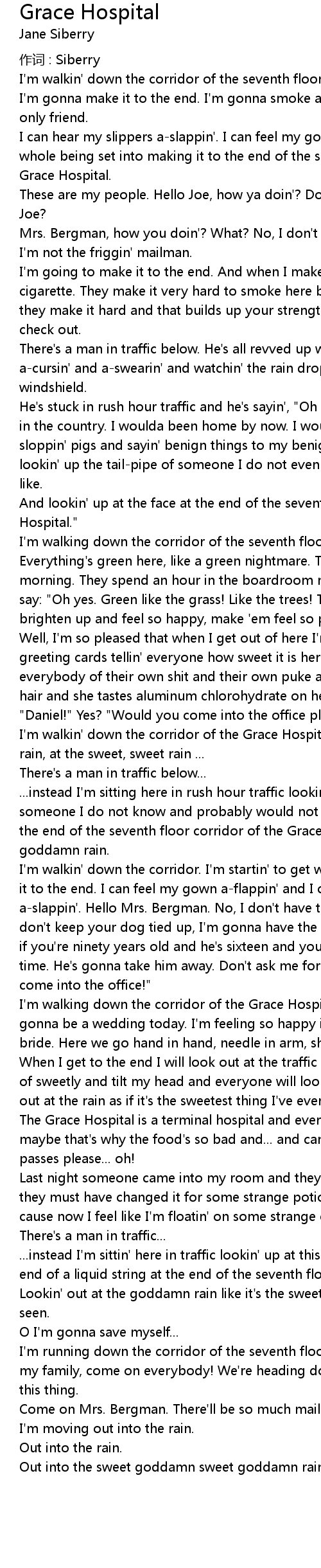 | I' m walkin' down the corridor of the Grace Hospital. I' m gonna look out at the rain, at the sweet, sweet rain ... | |