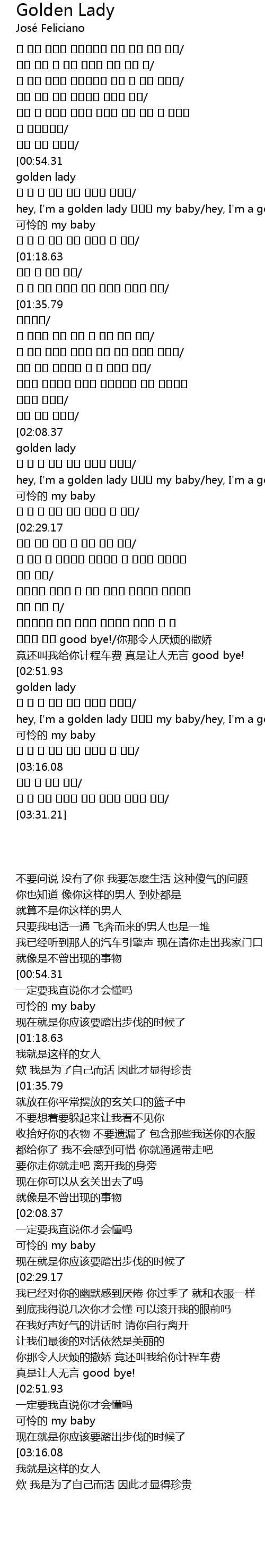 | [01:04.63] | hey, I'm a golden lady 불쌍한 my baby/hey, I'm a golden lady 可怜的 my baby |