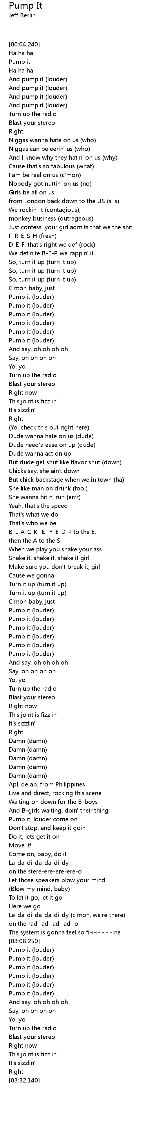 | [02:04.450] | Pump it (louder) |