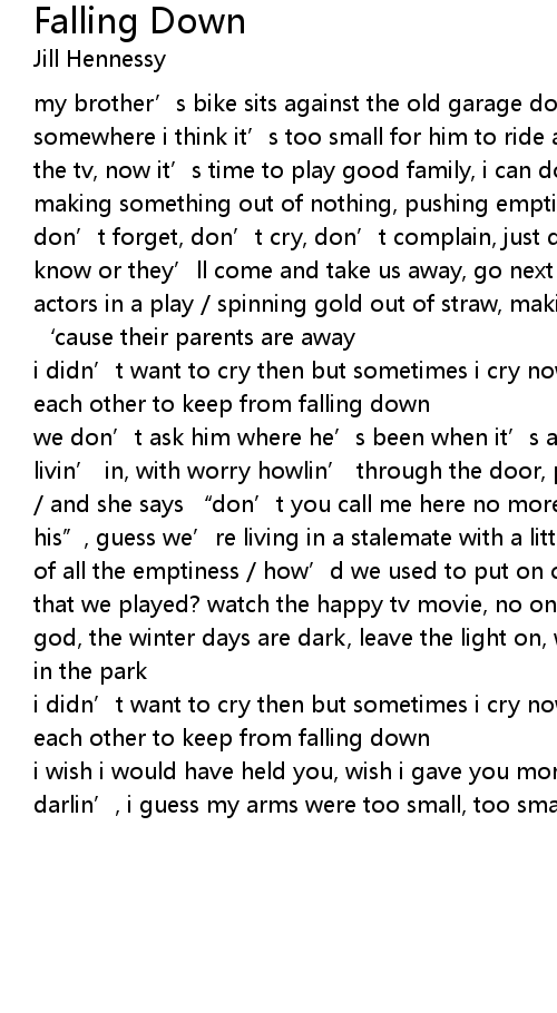 | my brother' s bike sits against the old garage door, i guess he' s back from somewhere i think it' s too small for him to ride anymore he sits to watch the tv, now it' s time to play good family, i can do it, i' m real good making something out of nothing, pushing emptiness away it ain' t so bad don' t forget, don' t cry, don' t complain, just don' t let the grownups know or they' ll come and take us away, go next door and ask for sugar, tiny actors in a play spinning gold out of straw, making something sweet for dinner ' cause their parents are away | |