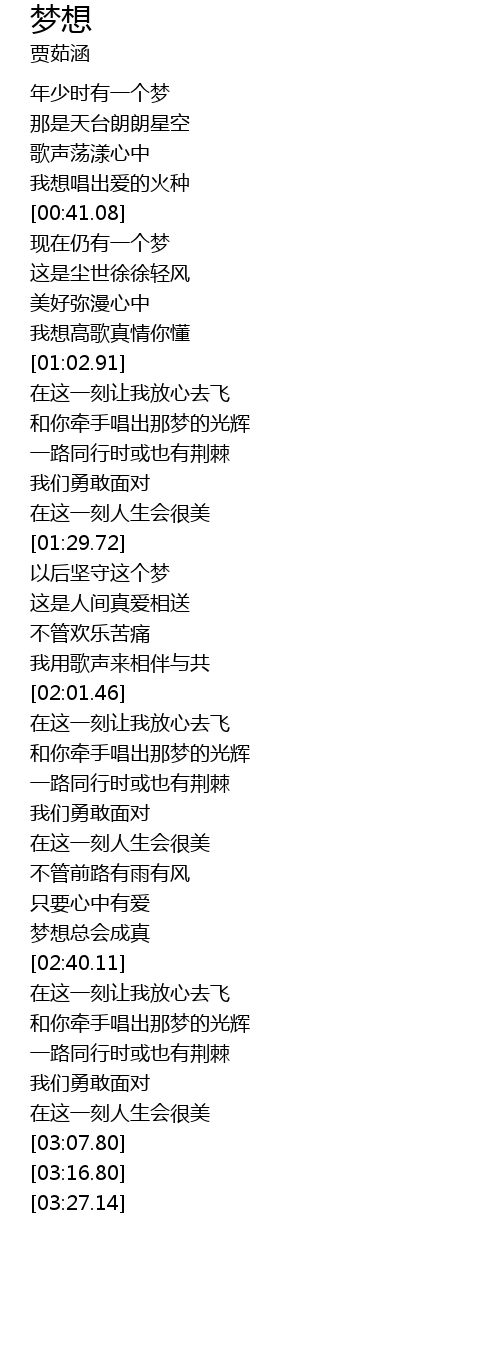 | [00:41.86] | xiàn zài réng yǒu yí gè mèng |