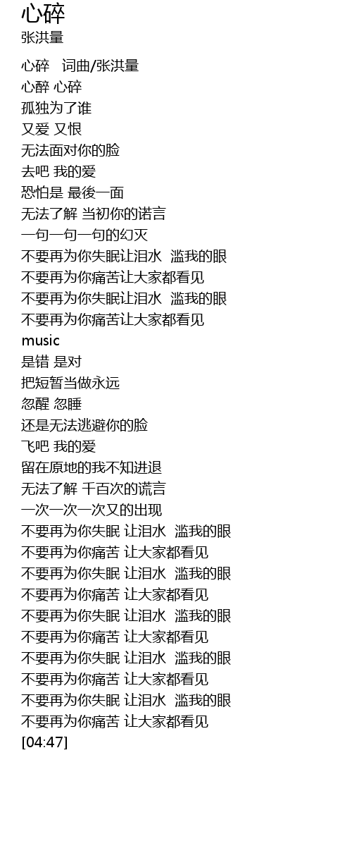 | [00:00] | 心碎 词曲/张洪量 |