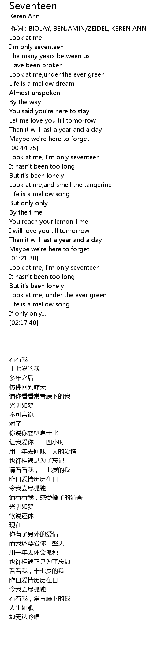 | [00:46.32] | Look at me, I' m only seventeen |