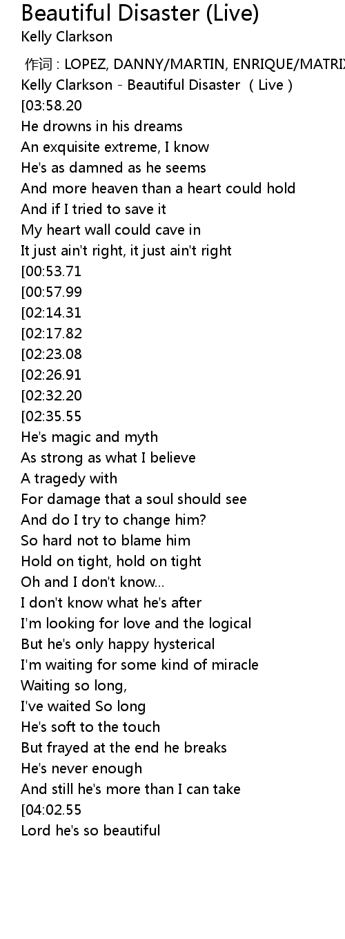 | [00:08.50] | Kelly Clarkson Beautiful Disaster Live |