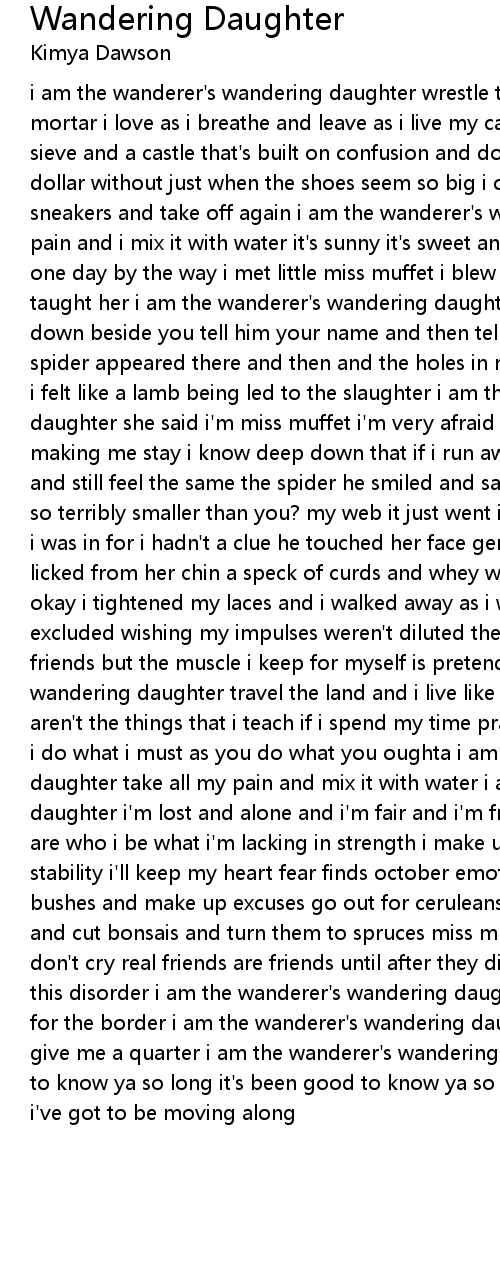 i am the wanderer's wandering daughter wrestle the pestle for the sake of the mortar i love as i breathe and leave as i live my cast iron shield's a titanium sieve and a castle that's built on confusion and doubt is a nickel within and a dollar without just when the shoes seem so big i can't win i fill my own sneakers and take off again i am the wanderer's wandering daughter take all my pain and i mix it with water it's sunny it's sweet and i don't purple stuff it one day by the way i met little miss muffet i blew my mind with the stuff that i taught her i am the wanderer's wandering daughter i said if a spider should sit down beside you tell him your name and then tell him the truth a great hairy spider appeared there and then and the holes in my soul started letting in wind i felt like a lamb being led to the slaughter i am the wanderer's wandering daughter she said i'm miss muffet i'm very afraid but something inside me is making me stay i know deep down that if i run away i'll just meet more spiders and still feel the same the spider he smiled and said how is this true when i am so terribly smaller than you? my web it just went in the way the wind blew what i was in for i hadn't a clue he touched her face gently with six of his legs and licked from her chin a speck of curds and whey when i was certain they'd both be okay i tightened my laces and i walked away as i walked away i was feeling excluded wishing my impulses weren't diluted the muscle i hustle is real for my friends but the muscle i keep for myself is pretend i am the wanderer's wandering daughter travel the land and i live like a martyr the things that i do aren't the things that i teach if i spend my time practicing when will i preach? i do what i must as you do what you oughta i am the wanderer's wandering daughter take all my pain and mix it with water i am the wanderer's wandering daughter i'm lost and alone and i'm fair and i'm free you am what you is and i are who i be what i'm lacking in strength i make up for in smarts you keep your stability i'll keep my heart fear finds october emotions are juices beat around bushes and make up excuses go out for ceruleans come home with chartreuses snip and cut bonsais and turn them to spruces miss muffet called me and she said don't cry real friends are friends until after they die still i romanticize all this disorder i am the wanderer's wandering daughter hop the next bus and run for the border i am the wanderer's wandering daughter give you my life if you give me a quarter i am the wanderer's wandering daughter so long it's been good to know ya so long it's been good to know ya so long it's been good to know ya i've got to be moving along |