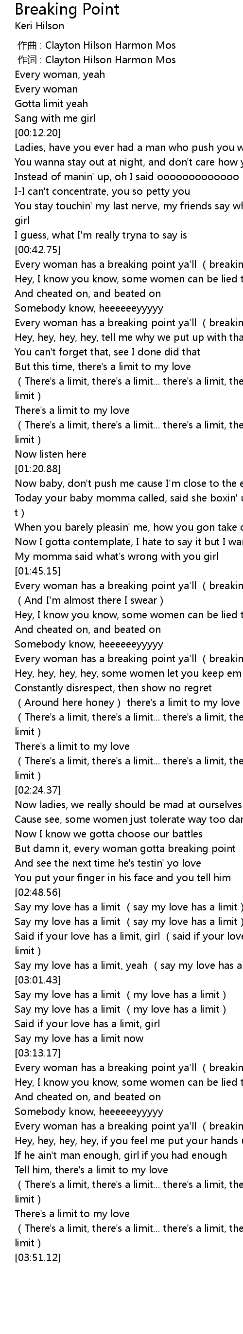 | [00:56.01] | Every woman has a breaking point ya' ll breaking point |