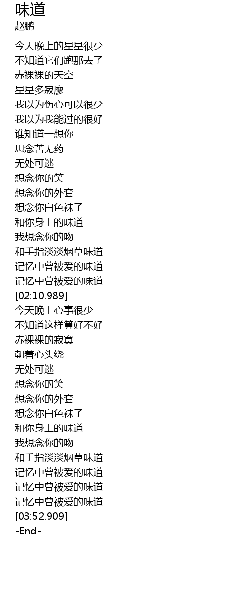 | [03:25.979] | 和手指淡淡烟草味道 |