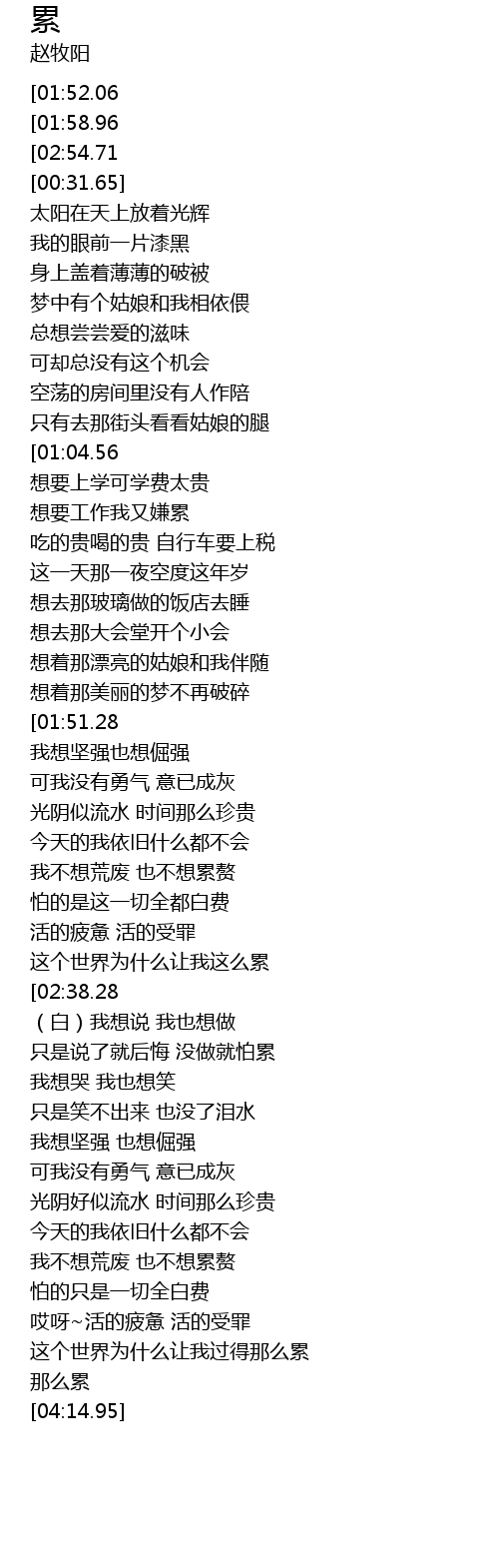 | [02:39.13][01:52.06][01:05.00][00:00.00] | -= 赵牧阳 《 累 》 =- |