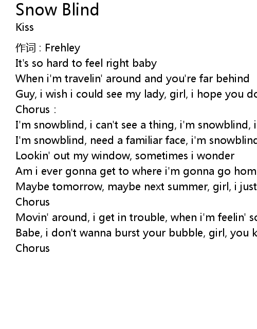 | I' m snowblind, need a familiar face, i' m snowblind, think i' m lost in space | |