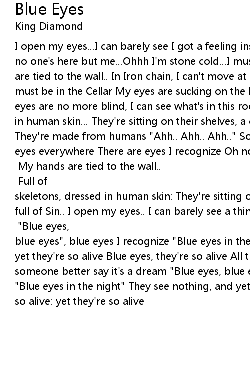 I open my eyes...I can barely see I got a feeling inside No one's here but me, no one's here but me...Ohhh I'm stone cold...I must be lying on a floor My hands are tied to the wall.. In Iron chain, I can't move at all Oh...I remember, I must be in the Cellar My eyes are sucking on the Dark to lighten the gloom My eyes are no more blind, I can see what's in this room Full of skeletons, dressed in human skin... They're sitting on their shelves, a cellar full of Sin.. They're made from humans "Ahh.. Ahh.. Ahh.." So many Puppets here, there are eyes everywhere There are eyes I recognize Oh no, it's the eyes of my love.. The eyes of my love Oh Victoria Nooooo [solo: Andy] My hands are tied to the wall.. In Iron chain, I can't move at all Oh...I remember [solos: Andy - Mike] Full of skeletons, dressed in human skin: They're sitting on their shelves, a cellar full of Sin.. I open my eyes.. I can barely see a thing All the tears in my eyes, someone better say it's a dream dream dream dream [solo: Mike] "Blue eyes, blue eyes", blue eyes I recognize "Blue eyes in the night" They see nothing, and yet they're so alive Blue eyes, they're so alive All the tears in my eyes, someone better say it's a dream "Blue eyes, blue eyes", blue eyes I recognize "Blue eyes in the night" They see nothing, and yet they're so alive Yet they're so alive: yet they're so alive |