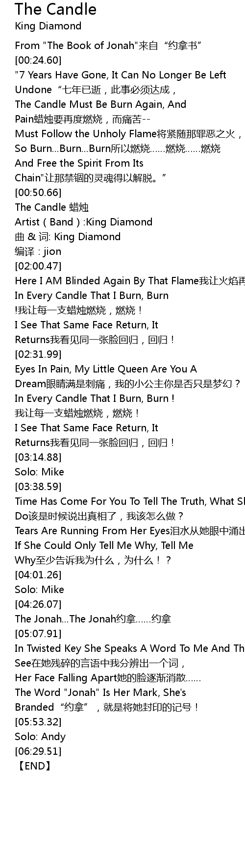| [02:14.94] | In Every Candle That I Burn, Burn !我让每一支蜡烛燃烧,燃烧! |